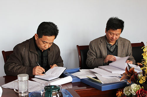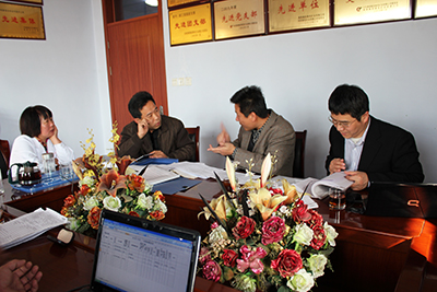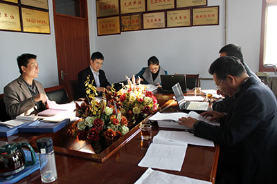 书记、副院长刘伟与检查组解说公司相关规章制度 检查组一行5人在讨论