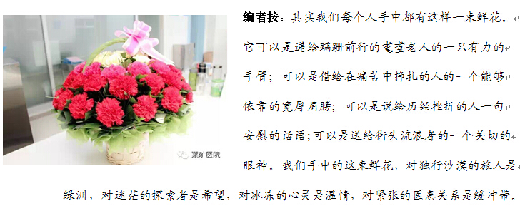 2月3日讯 ( 记者 李淑洁) 2月2日上午10点,在莱矿医院康复医学科的医生办公室里,一位30多岁的年轻妇女司女士亲手将一盆附有“医德好人”感谢语的鲜花送给了康复医学科主任徐传荣。