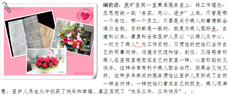 编后小记:司大爷内心独白 □ 在莱矿医院康复医学科,我不仅得到了身体上的治疗,也得到了心灵上的开导,自从生病以来,我就一直郁郁寡欢,甚至一度拒绝接受治疗。在贵院医护人员的细心照料下,目前变得开朗起来,能够坦然面对病情。千言万语道不尽我心中的感慨,形象的比拟描绘不出我此刻的心情。在此,我让我家人代表我感谢徐主任,孙医生、亓医生及莱矿医院康复医学科全体医护人员。同时,祝贵院蒸蒸日上,越办越好,为更多的三瘫患者带去希望。祝贵院的病友们早日康复!莱芜康复首选莱矿医院!